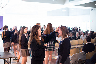 As a Catholic school, gathering to worship and pray is rooted in traditional Catholic liturgical forms and guided by our charism of drawing all into One. Through the celebration of Mass, our community shares in the Sacrament of Eucharist and, as we receive the nourishment of the Body of Christ, we are called to go into the world as nourishment for others. For Mass, a priest is invited to campus to lead our community in the readings and prayers, and to celebrate Eucharist with us. In other, non-Eucharistic liturgies, a member of our school community, such as a student member of the Spiritual Life Council, a teacher, or an administrator, leads the community through the celebration. The term “Prayer Service” is used on our calendar to refer to non-Eucharistic liturgies. Whether it be through Mass or another type of liturgical celebration, our corporate, or communal prayer is always an opportunity to celebrate, reflect, offer praise and give thanks. Liturgy, in all of its forms, always calls us to the work of unifying love and challenges us to love God and neighbor without distinction.